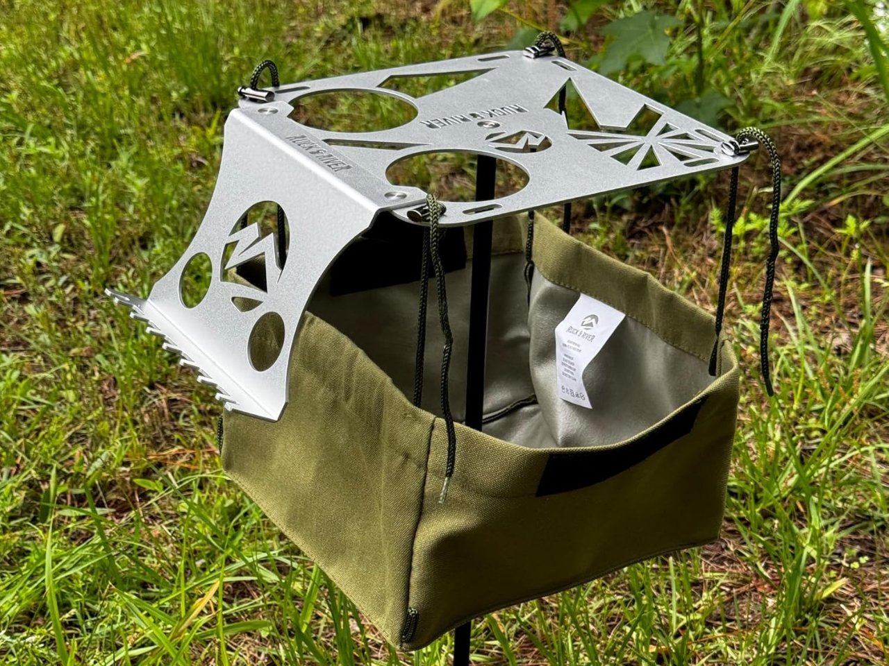 There’s also a universal accessory holder that can be attached to the front face of the table to prop up your other accessories like your phone, spoon, book, or to hang your tools. An adjustable polyester storage bag transforms your transport case into an adjustable storage catch below that can hold utensils, snacks, or small essentials. There’s also an integrated compartment to organize the ground spike pieces.