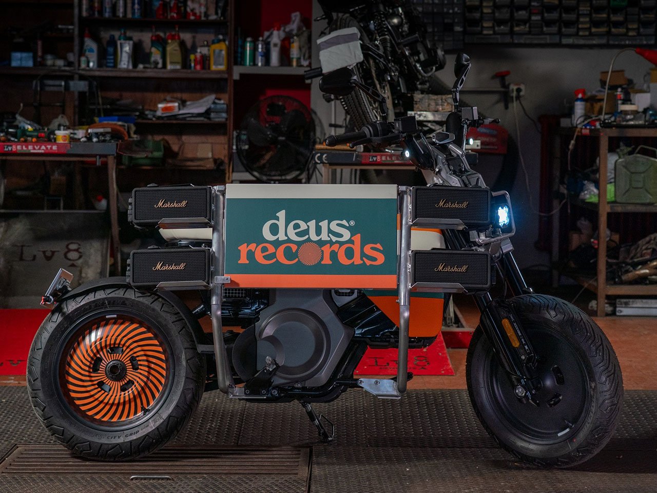 A bold reinterpretation of the original CE 02, the DE-02 also draws inspiration from the creative universe of Deus Records, blending lifestyle culture with electric mobility. Departing from the usual utility-focused configurations, this version transforms the “eParkourer” concept into a fully functional DJ booth on two wheels. In place of a surf rack, the bike features a bespoke sound system equipped with four Marshall Middleton speakers and a centrally mounted turntable, inviting riders to mix music anywhere, right from urban alleys to remote mountainscapes. The design is elevated with a hand-stitched leather saddle embroidered with the Deus Records logo, seamlessly integrated with the speaker system and turntable setup.