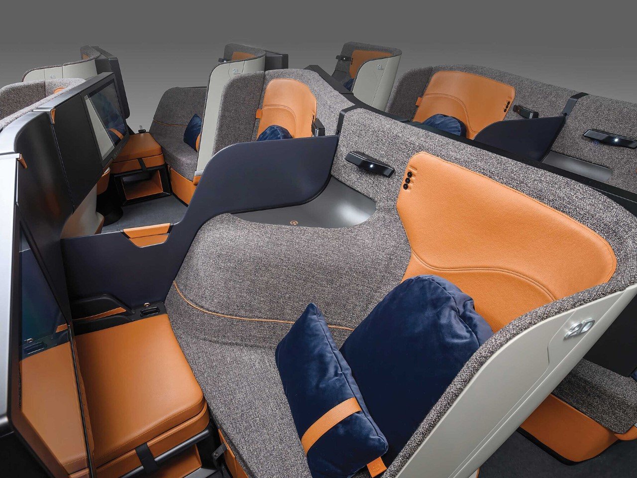 None of this means SoFab skimps on comfort. The design still includes privacy dividers, integrated power ports, and fixed entertainment screens up to 21 inches. The tray table folds out in stages, becoming a usable side surface even when you’re not dining. Storage is intentionally modest, but adequate, perfect for passengers who value relaxation over productivity during a flight.