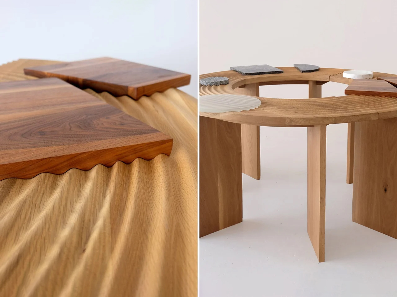 Outside In is a multifunctional, shapeshifting table inspired by the balance, harmony, and serene design of Japanese Zen gardens. Featuring hand-carved grooves in its timber frame, the table evokes the raked patterns of these gardens, blending minimalist design with natural elements. Designed by Samuel Burns for Sabu Studio, the table is both an art piece and a practical furniture solution. Its sinuous timber surface is paired with hand-carved granite and marble elements that slide across the grooves, offering adaptable flat surfaces.