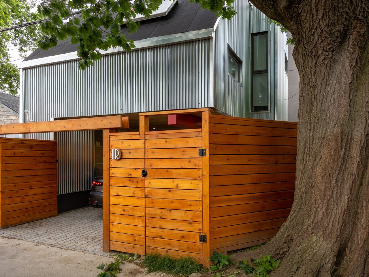 The house takes shape in response to the most immediate of obstacles—a mature maple tree. Rather than cut it down, the architects lifted the home’s primary volume, allowing air, water, and roots to move naturally beneath. This move preserves the tree and also breathes permeability into the site, with the open carport doubling as a flexible outdoor room. A double cantilevered beam gives the structure a sense of quiet drama, while the cedar-lined underside introduces warmth that balances the metal’s cool clarity.